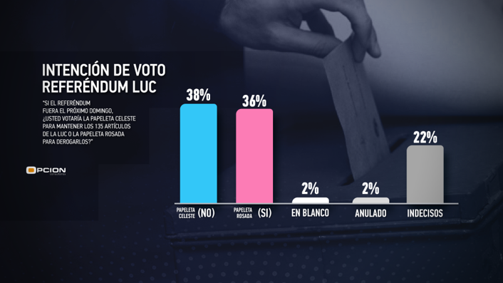 38% votaría la papeleta celeste del NO y 36% la papeleta rosada del SI de cara al próximo referéndum sobre la Ley de Urgente Consideración. El escenario es abierto y competitivo, con una ventaja potencial del NO debido al efecto del voto en blanco y el perfil de los indecisos.