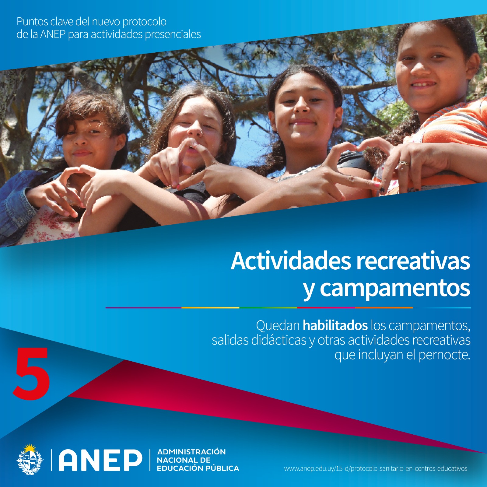 El Consejo Directivo Central resolvió por Resolución N° 413/022, del 9 de marzo de 2022, autorizar en el ámbito de la Administración Nacional de Educación Pública y de los centros privados habilitados, la realización de campamentos, salidas didácticas y otras actividades de similar naturaleza, quedando incluidas las actividades con pernocte.