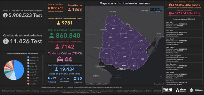 De los 1.363 casos nuevos, 499 son de Montevideo, 135 de Canelones, 119 de Colonia, 86 de Lavalleja, 72 de Maldonado, 63 de San José, 48 de Treinta y Tres, 43 de Florida, 41 de Paysandú, 41 de Rivera, 37 de Tacuarembó, 36 de Cerro Largo, 30 de Soriano, 28 de Rocha, 26 de Durazno, 23 de Salto, 20 de Río Negro, 11 de Artigas, y 5 de Flores.