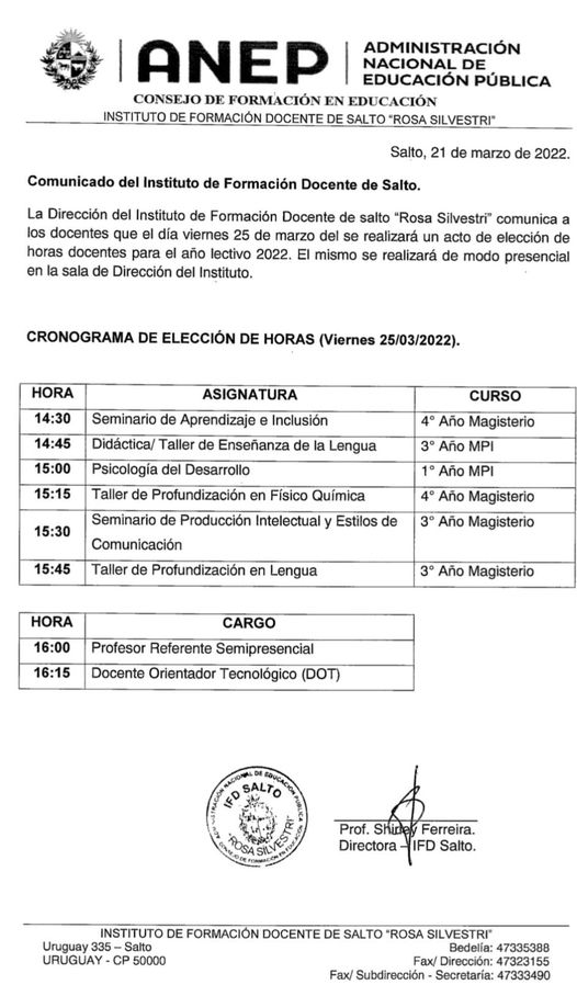 La Direccion del Instituto de Formacion Docente de Salto «Rosa Silvestri «, comunica a los docentes que el dia viernes 25 marzo , se llevara a cabo un acto de eleccion de horas docentes, para el año lectivo 2022.