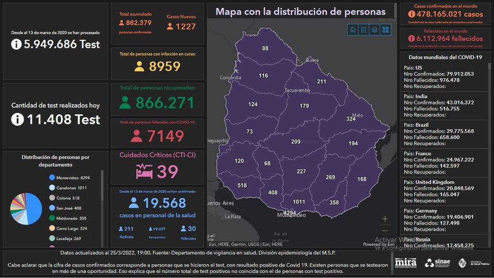De los 1.227 casos nuevos, 628 son de Montevideo, 166 de Canelones, 60 de Cerro Largo, 52 de San José, 40 de Lavalleja, 38 de Colonia, 32 de Tacuarembó, 31 de Maldonado, 30 de Rocha, 25 de Rivera, 22 de Treinta y Tres, 18 de Durazno, 18 de Florida, 13 de Río Negro, 12 de Flores, 12 de Salto, 11 de Soriano, 10 de Artigas y 9 de Paysandú.
