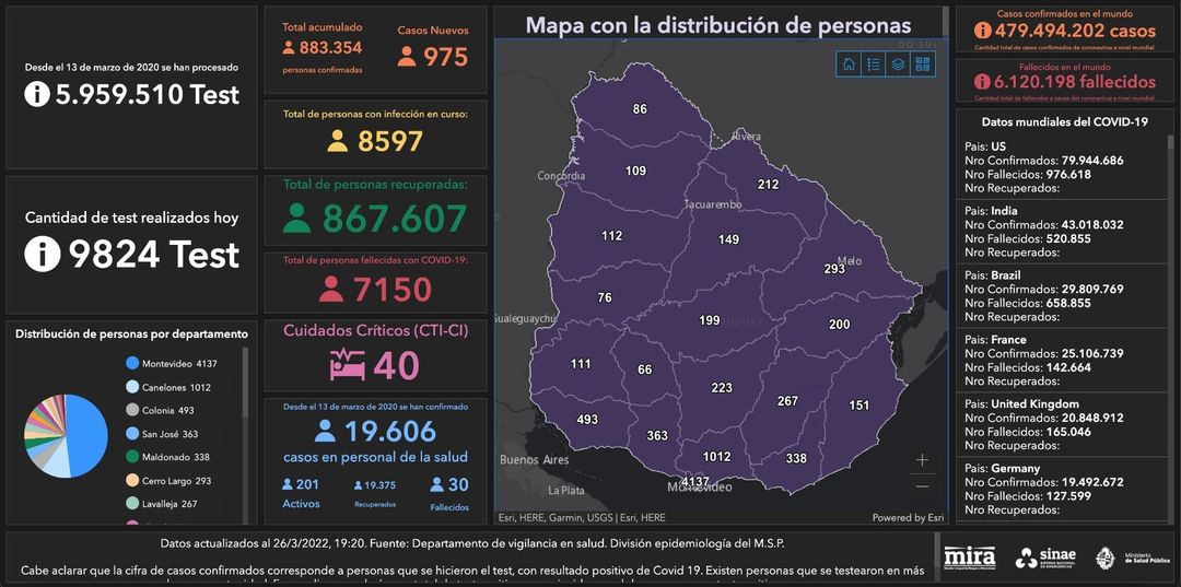 De acuerdo a la información proporcionada por el Ministerio de Salud Pública (MSP), hoy se llevaron a cabo 9.824 análisis y se detectaron 975 nuevos casos de Coronavirus COVID-19.