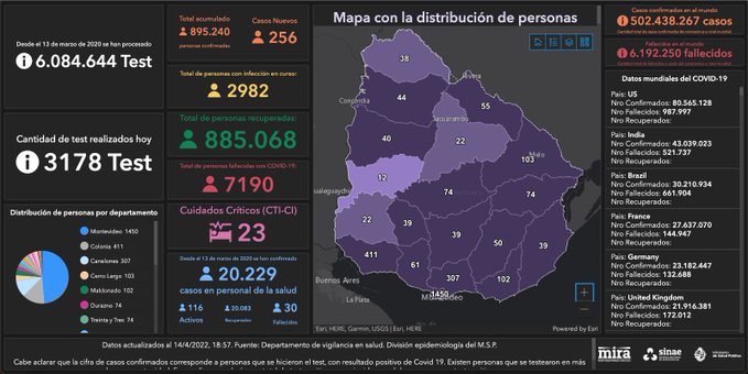 De los 256 nuevos casos, 120 son de Montevideo, 27 de Canelones, 16 de Rivera, 14 de Maldonado, 13 de Lavalleja, 11 de Durazno, 10 de Cerro Largo, 9 de Colonia, 7 de Paysandú, 7 de Treinta y Tres, 6 de Rocha, 4 de Florida, 3 de San José, 3 de Tacuarembó, 2 de Salto, 2 de Soriano, 1 de Flores y 1 de Río Negro.