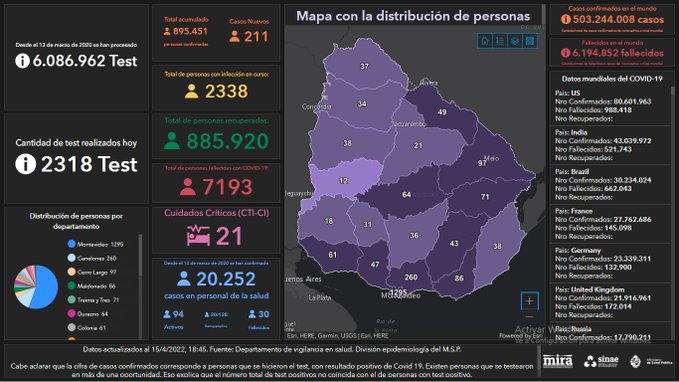 De los 211 nuevos casos, 127 son de Montevideo, 18 de Maldonado, 16 de Canelones, 9 de Cerro Largo, 7 de Treinta y Tres, 6 de Colonia, 6 de Rivera, 5 de Rocha, 4 de Durazno, 4 de San José, 2 de Florida, 2 de Paysandú, 2 de Tacuarembó, 1 de Río Negro, 1 de Salto y 1 de Soriano.