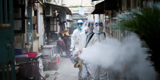 Trabajadores con trajes de protección desinfectan una antigua zona residencial en Shanghái, China, el 15 de abril de 2022. REUTERS/Aly SongLa Comisión Nacional de Sanidad detalló asimismo que, hasta la pasada medianoche local (16.00 GMT del viernes), se dio de alta a 2.818 pacientes tras superar con éxito el COVID.