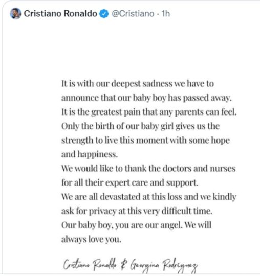 Cristiano Ronaldo y su pareja Giorgia Rodriguez anuncian la triste noticia del fallecimiento de uno de sus mellizos recien nacidos.