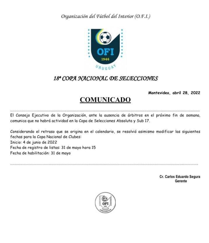 Dado el parate del Nacional de Selecciones de éste fin de semana (por ausencia de Arbitros), OFI resulve posponer para el próximo 4 de junio el inicio del Torneo Nacional de Clubes de OFI en sus 2 Divisionlaes.