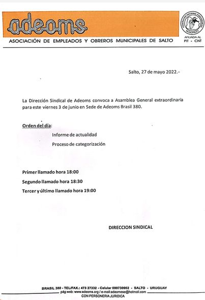 En el marco del proceso de negociaciones entre Adeoms y la intendencia de salto, la Dirección Sindical de Adeoms convoca a Asamblea General este viernes 3 de junio en sede de Adeoms Brasil 380.
