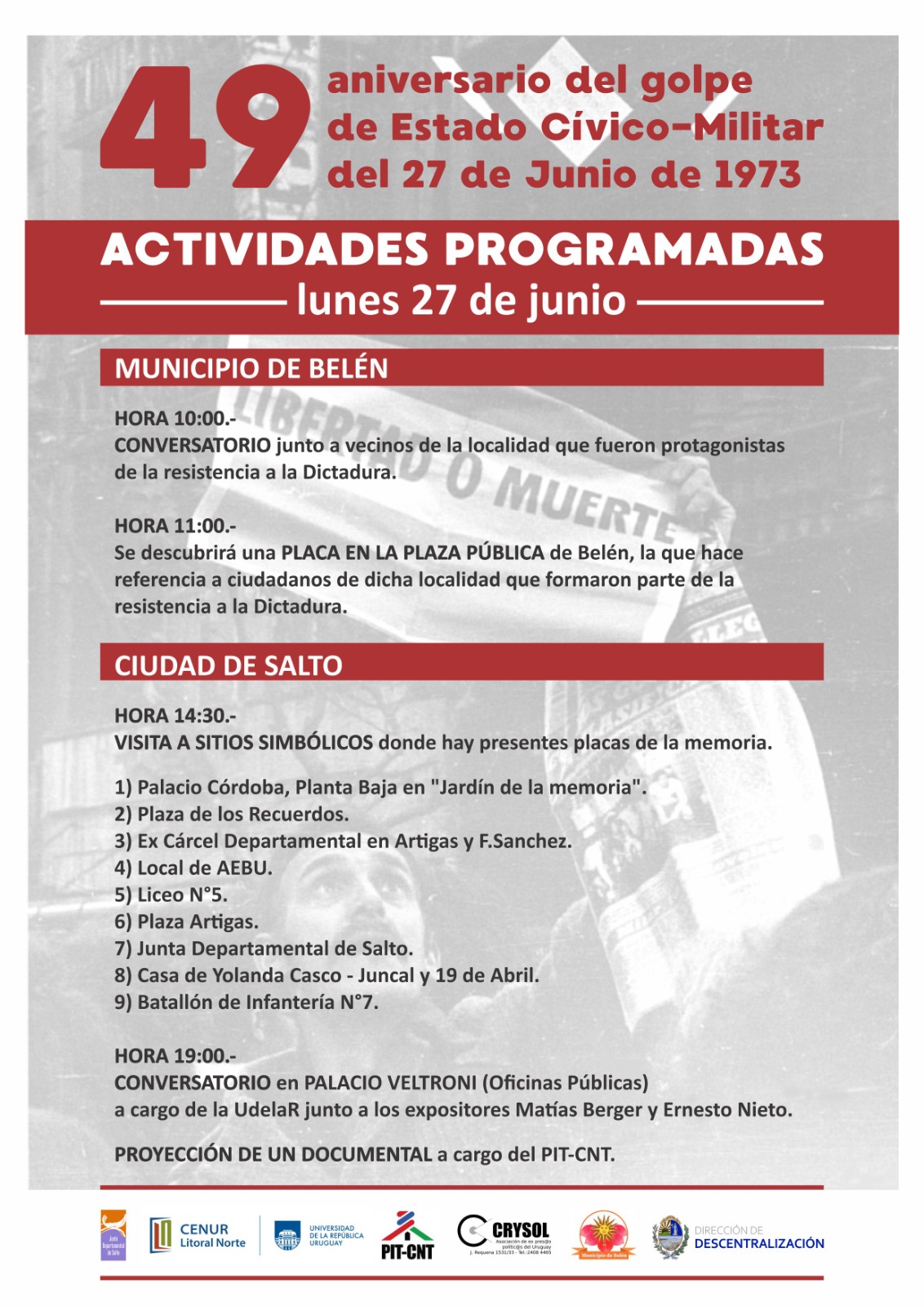 El próximo lunes 27 de junio se cumplen 49 años del Golpe de Estado en Uruguay y la Intendencia de Salto, Junta Departamental de Salto, UdelaR, PIT-CNT y Crysol organizan una serie de actividades a lo largo de toda la jornada.