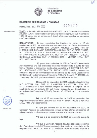 En la Licitación Pública 2/2021 del Ministerio de Economía y Finanzas, por medio de la Dirección Nacional de Aduanas, en la página de Compras estatales del Uruguay, informa que se contrató un Servicio de conserjería para su Edificio Central.