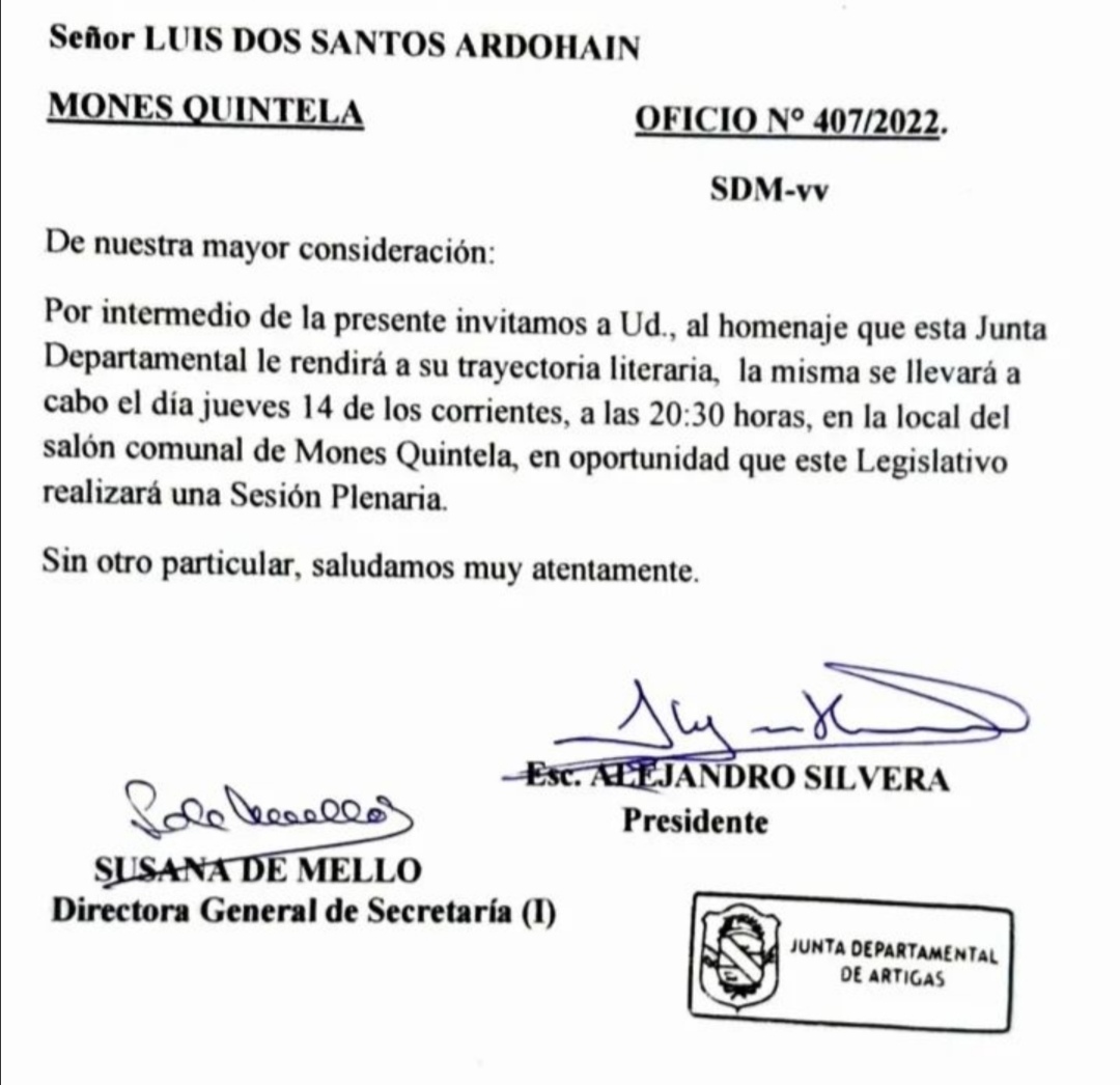 Por intermedio de la presente invitamos a Ud, al homenaje que esta Junta Departamental le rendira a su trayectoria literaria, la misma se llevara acabo el dia jueves 14 de los corrientes , a las 20:30 horas , en el local del salon comunal de Mones Quintela, en oportunidad que este Legislativo realizara una Sesion Plenaria.