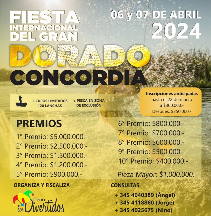 El primer fin de semana de abril en Concordia se desarrollará el primer torneo internacional de pesca del dorado y repartirá más de 15 millones de pesos entre los ganadores. Con la organización y fiscalización de Peña Los Divertidos la misma tendrá lugar en zona del Camping La Tortuga. Cabe destacar que el cupo es limitado para 120 lanchas en esta primera edición y la competencia se dará en zona de exclusión de la Represa de Salto Grande.