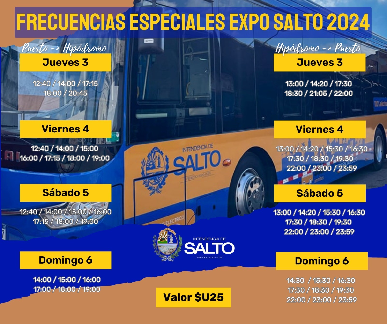 La División Ómnibus de la Intendencia de Salto informa los horarios del servicio especial con motivo de la realización de la 116ª edición de la Expo Salto en el predio de la Asociación Agropecuaria de Salto entre el jueves 3 y el domingo 6 de octubre. El costo del boleto será el mismo del servicio urbano: 25 pesos por viaje. Los abonos y pases libres no tendrán validez para este servicio especial.