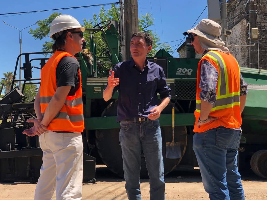 Durante la visita, recorrieron la colocación de carpeta asfáltica en la calle Instrucciones del Año XIII, una obra ejecutada por la empresa Álvarez bajo la supervisión del equipo técnico y la Dirección de Obras de la Intendencia.