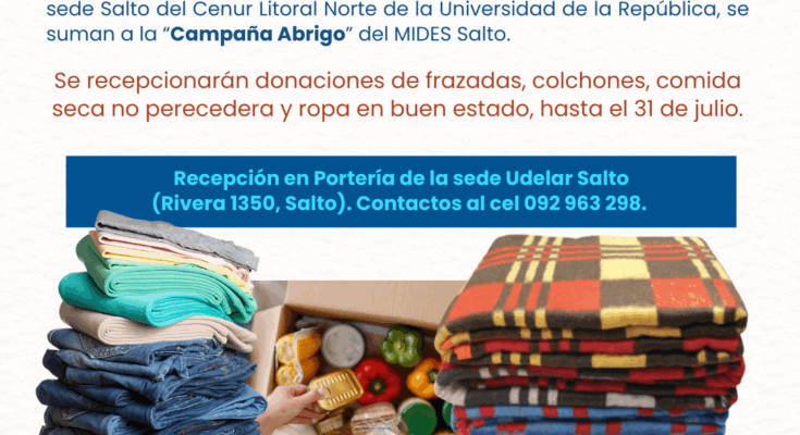 Ante el impulso de la “Campaña Abrigo” que lleva adelante el Ministerio de Desarrollo Social (MIDES) en nuestro departamento, la sede Salto del Cenur Litoral Norte de la Universidad de la República y los gremios que nuclean a sus funcionarios, se suman a la campaña de recolección de donaciones con destino a personas en situación de vulnerabilidad. Estas podrán ser de frazadas, colchones y comidas secas no perecederas.