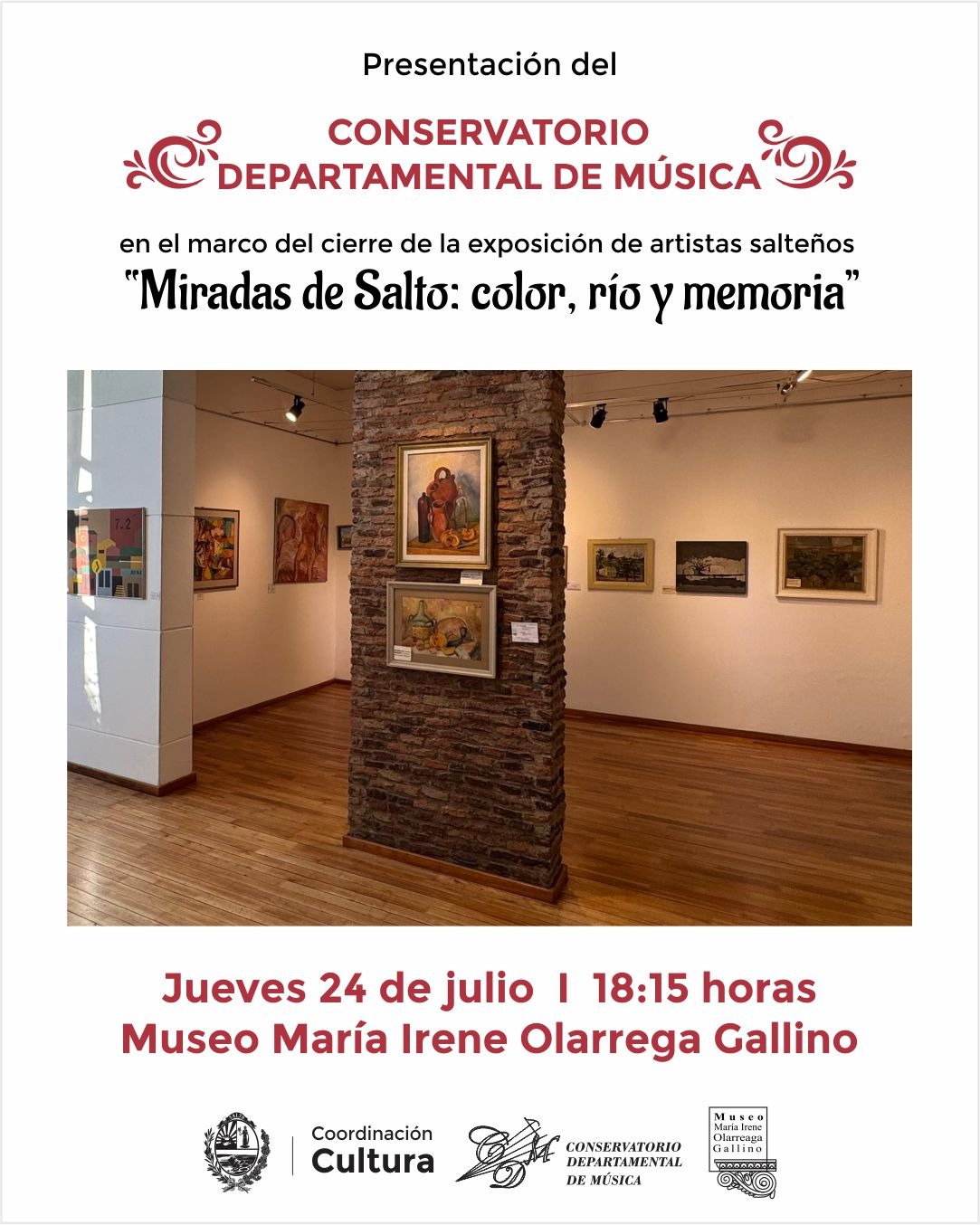 La Intendencia de Salto, a través de la Coordinación de Cultura, invita a la presentación del Conservatorio Departamental de Música, que tendrá lugar en el marco del cierre de la exposición de artistas salteños «Miradas de Salto: color, río y memoria».