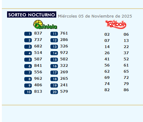 Resultados del sorteo de quiniela y tombola de este miercoles 5 de noviembre de 2025. Comparte esto: Haz clic para compartir en Facebook (Se abre en una ventana nueva) Facebook Haz clic para compartir en WhatsApp (Se abre en una ventana nueva) WhatsApp Haz clic para compartir en X (Se abre en una ventana nueva) X Haz clic para compartir en Telegram (Se abre en una ventana nueva) Telegram Relacionado Navegación de entradas Carolina Cosse sobre Danza: «Ya hay una expresión de la Jutep, vamos a esperar estas horas para ver qué reflexionesGobierno aplicará desde el 1° de diciembre la ley de medidas económicas de frontera