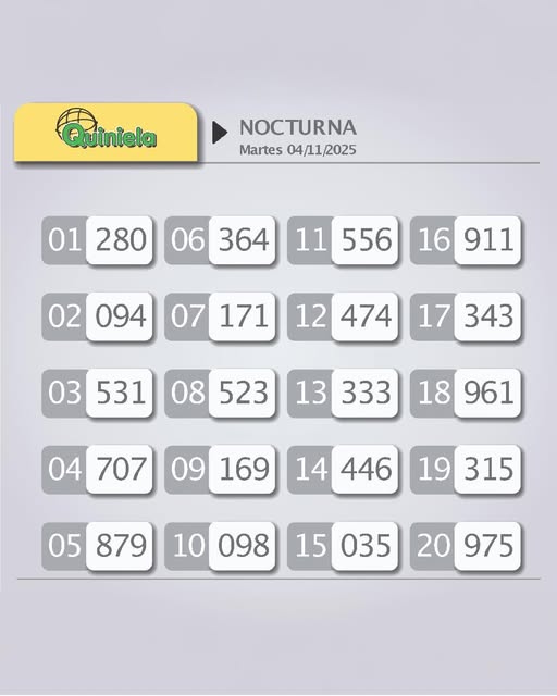 Hola! Les compartimos los resultados del sorteo nocturno del martes 4 de noviembre Comparte esto: Haz clic para compartir en Facebook (Se abre en una ventana nueva) Facebook Haz clic para compartir en WhatsApp (Se abre en una ventana nueva) WhatsApp Haz clic para compartir en X (Se abre en una ventana nueva) X Haz clic para compartir en Telegram (Se abre en una ventana nueva) Telegram Relacionado Navegación de entradas Quién es Doca, líder del Comando Vermelho y uno de los blancos del megaoperativo en Río de Janeiro